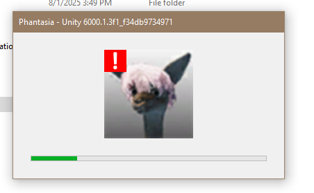 Um… Corrupted download, maybe? What should happen is a “Made with Unity” full screen logo, then an embarassingly long black period, then straight into a login screen with a pretty girl tending to a baby dragon. That’s the point at which my own code is loaded and running, but it seems like it doesn’t get that far?